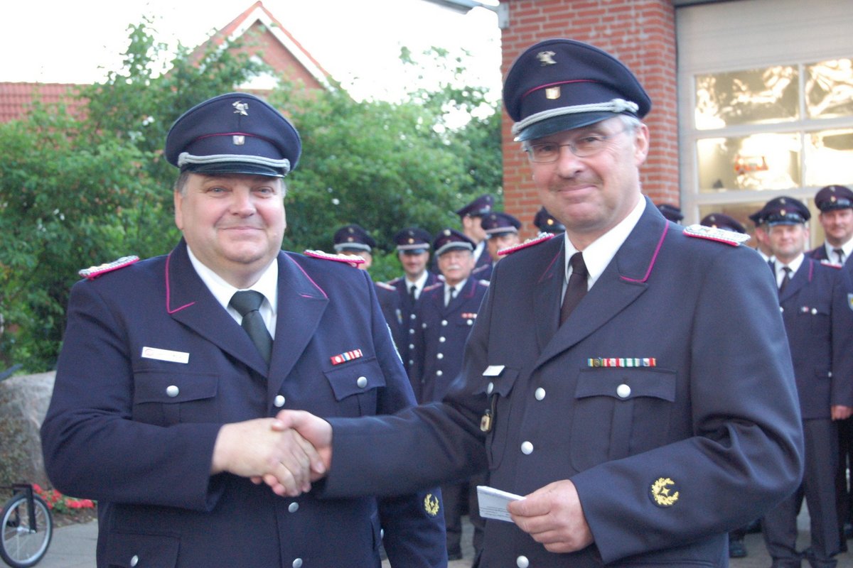 Bevor die Wehr und ihre Gäste zum Grillschinken ins Feuerwehrhaus einrückten, überreichte Heinrich Möller noch eine Ehrenurkunde an den Gerätewart Manfred Ströh, der dieses Amt nun seit zwanzig Jahren inne hat und bedankte sich für seinen Einsatz, gerade auch im Vorfeld der Leistungsbewertung. Nachdem sich alle gestärkt hatten, bedankte sich Bürgermeister Ulfert Geertz, selber aktives Mitglied der Feuerwehr, bei den Kameraden für ihre Einsatzbereitschaft. Schließlich überreichte der Kamerad Michael Stock ein Hohlstrahlrohr, das sich die Atemschutzgeräteträger schon lange gewünscht hatten und das nun seine Firma Baltic Social Consult gespendet hat, an den Wehrführer, der es an die 1. Gruppe übergab.