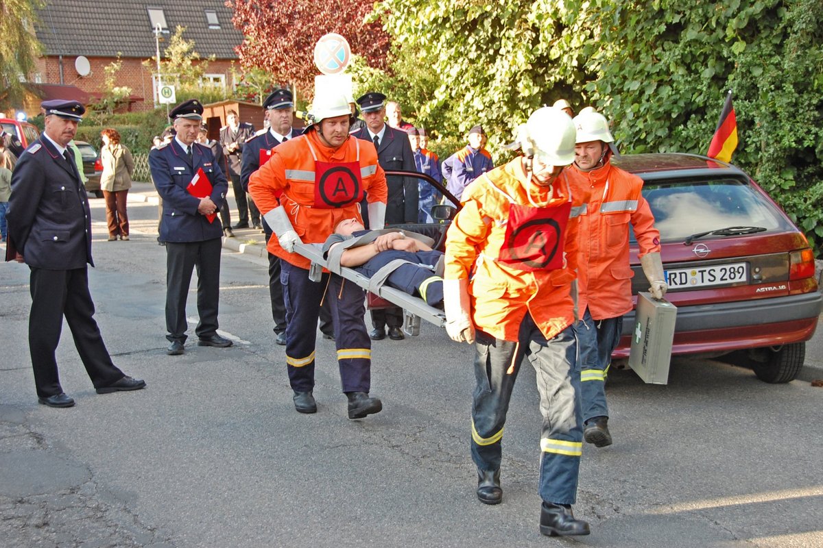 Nachdem die Wehr die Einsatzschutzkleidung angezogen hatte, diese durch die Kommission begutachtet wurde und die Kenntnisse über Feuerwehrknoten und -stiche nachgewiesen waren, zeigte eine Gruppe unter Leitung des Reservegruppenführers Wolfgang Ströh einen Hilfeleistungseinsatz nach einem Verkehrsunfall. Hier galt es, die Unfallstelle abzusichern und eine Person aus dem Fahrzeug zu retten. Da die Holtseer Wehr nicht über hydraulisches Rettungsgerät verfügt, wurde in der Lage davon ausgegangen, dass sich die Türen des Pkw öffnen ließen und die Person nicht eingeklemmt war.