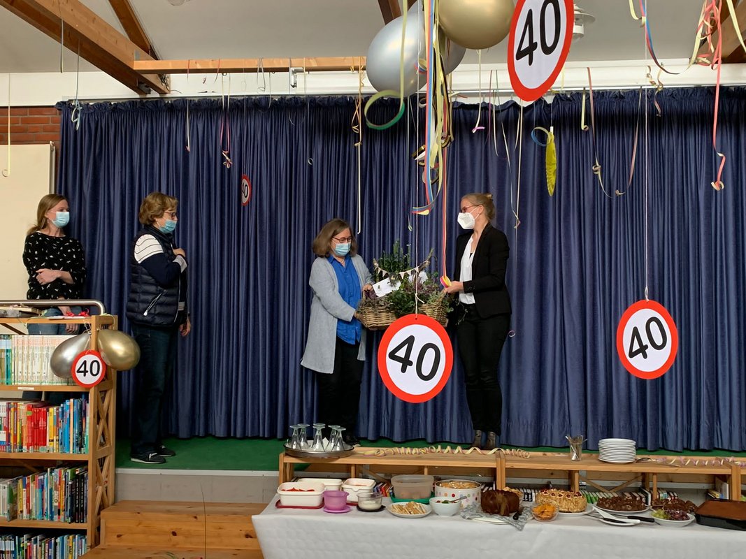Es stand ein ganz besonderer Tag in der Grundschule Borgstedt an. Nein, es war nicht der Zeugnistag, auch kein Geburtstag und auch nicht der letzte Schultag vor den Ferien. Es war das 40. Dienstjubiläum unserer Frau Haase. Seit 40 Jahren ist sie nun schon Lehrerin und wer glaubt, dass Frau Haase nach so langer Zeit keine Lust mehr auf den Beruf hat, der kennt unsere Frau Haase nicht. Sie geht ihrem Beruf noch immer mit so viel Herzblut und Freude nach, dass Sie unseren Schulalltag jeden Tag aufs Neue in ganz besonderem Maße bereichert und für das gesamte Kollegium ein Vorbild ist. So ein Dienstjubiläum für so eine besondere Lehrerin und Kollegin musste natürlich auch besonders gewürdigt werden. Sprechchöre in der großen Pause, die in ganz Borgstedt zu hören waren, feierliche Worte von der Schulleitung und vom Schulverband sowie eine festlich geschmückte Aula und ein gemütliches Beisammensein im Kollegium brachten Frau Haase zum Staunen.