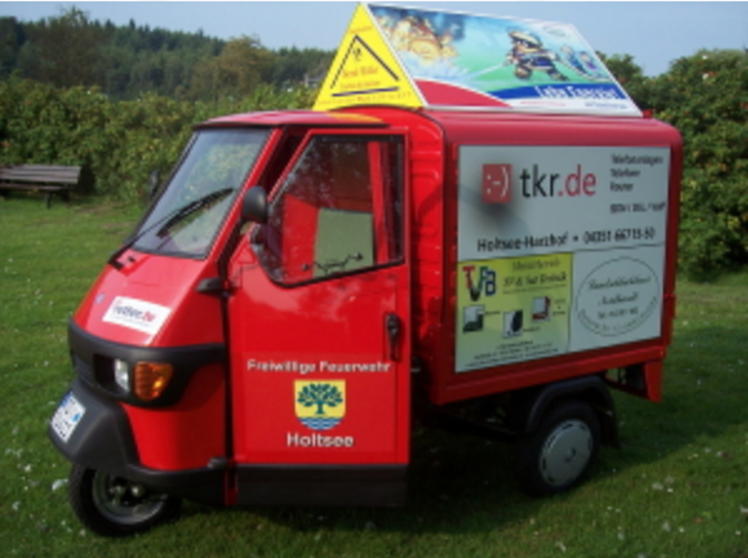 Um 17 Uhr wurde unserer Wehr ein neues Fahrzeug übergeben. Die Piaggio Ape 50 soll aber nicht für die Brandbekämpfung eingesetzt werden oder dem Wehrführer als Führungsfahrzeug dienen, und mit ihren 40 km/h Höchstgeschwindigkeit taugt sie auch nicht als Vorausrüstwagen. Das Dreirad wird den Brandschutzerziehern um Michael Möller zur Verfügung gestellt. Damit können sie ihre Ausrüstung, die unter anderem einen sogenannten Feuertrainer und ein Rauchhaus umfasst, transportieren. Der feuerrote Einsitzer dient dabei nicht nur als Transportmittel sondern auch als Hingucker. Um das Fahrzeug zu finanzieren, wurden rundum Werbeflächen an Sponsoren verkauft, die es somit ermöglicht haben, das Fahrzeug und das Zubehör anzuschaffen.
