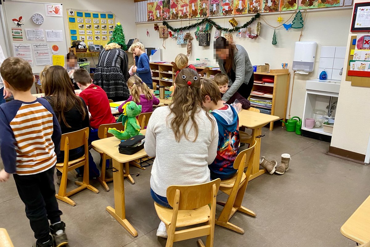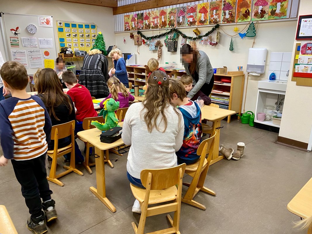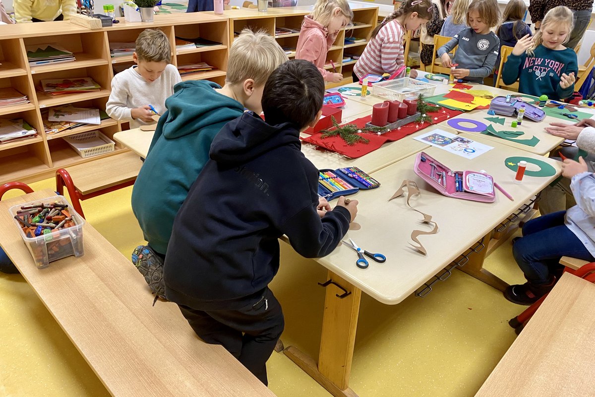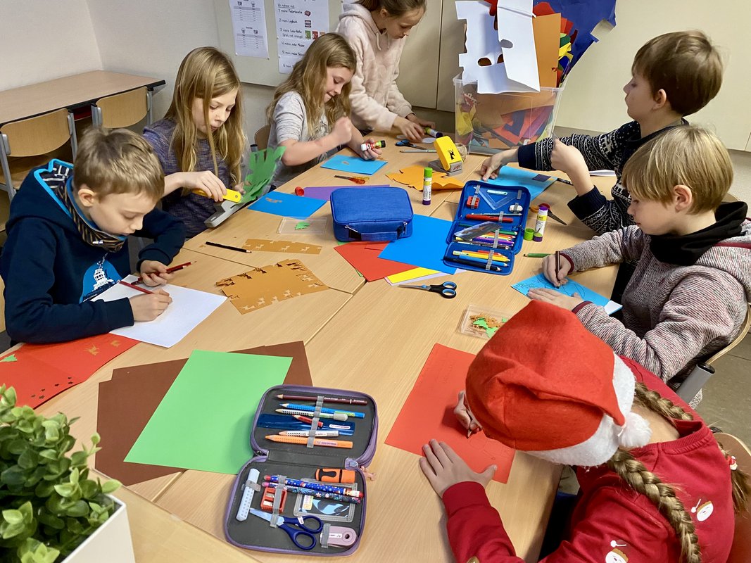 Danach ging es in die Klassenräume zum Basteln. Durch die tatkräftige Unterstützung zahlreicher Eltern erstrahlen die Schulfenster nun in fröhlichen Weihnachtsmotiven.