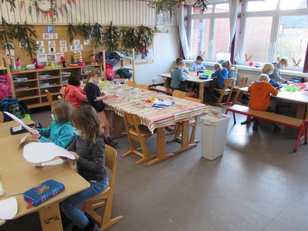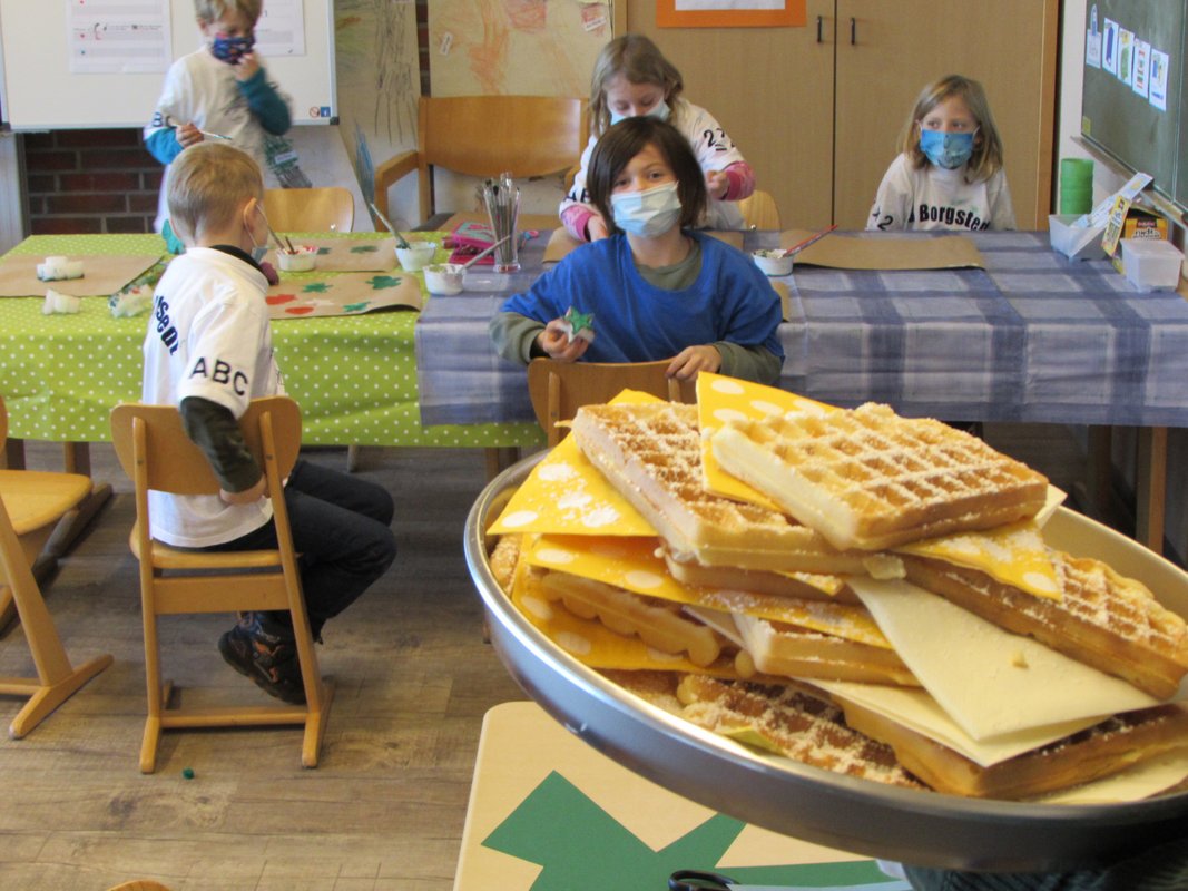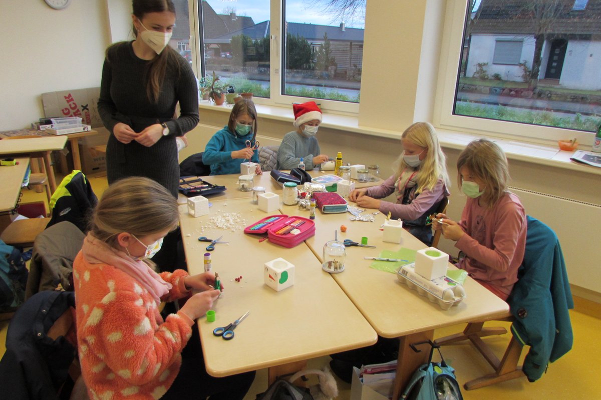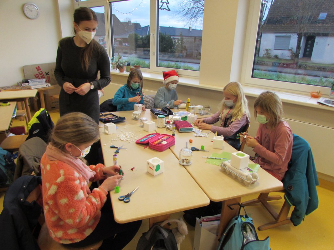Der Nikolaustag ist in der Grundschule Borgstedt gleichzeitig der große Basteltag. In weihnachtlicher Atmosphäre mit Lichterketten, Weihnachtmusik und einem kleinen Gruß vom Nikolaus hieß es auch dieses Jahr wieder: „Auf die Klebe, Schere, los!“. In allen Klassen wurde fleißig gebastelt und so entstanden in den einzelnen Wichtelwerkstätten Fensterbilder, Weihnachtsbaumanhänger, Weihnachtskarten, Schneekugeln und vieles mehr. Der Duft von frisch gebackenen Waffeln strömte durchs Schulhaus und kurze Zeit später gab es einen leckeren Gruß aus der Schulküche. Damit sich die Finger vom Schneiden erholen konnten, lud Pippi Langstumpf jede Klasse zwischendurch in die Schulaula ein, um mit ihr Weihnachten zu feiern. Nach diesem Kinobesuch ging es dann natürlich weiter mit dem Basteln und durch die vielen fleißigen Wichtelhände erstrahlt unser Schulhaus nun in weihnachtlichem Glanz.