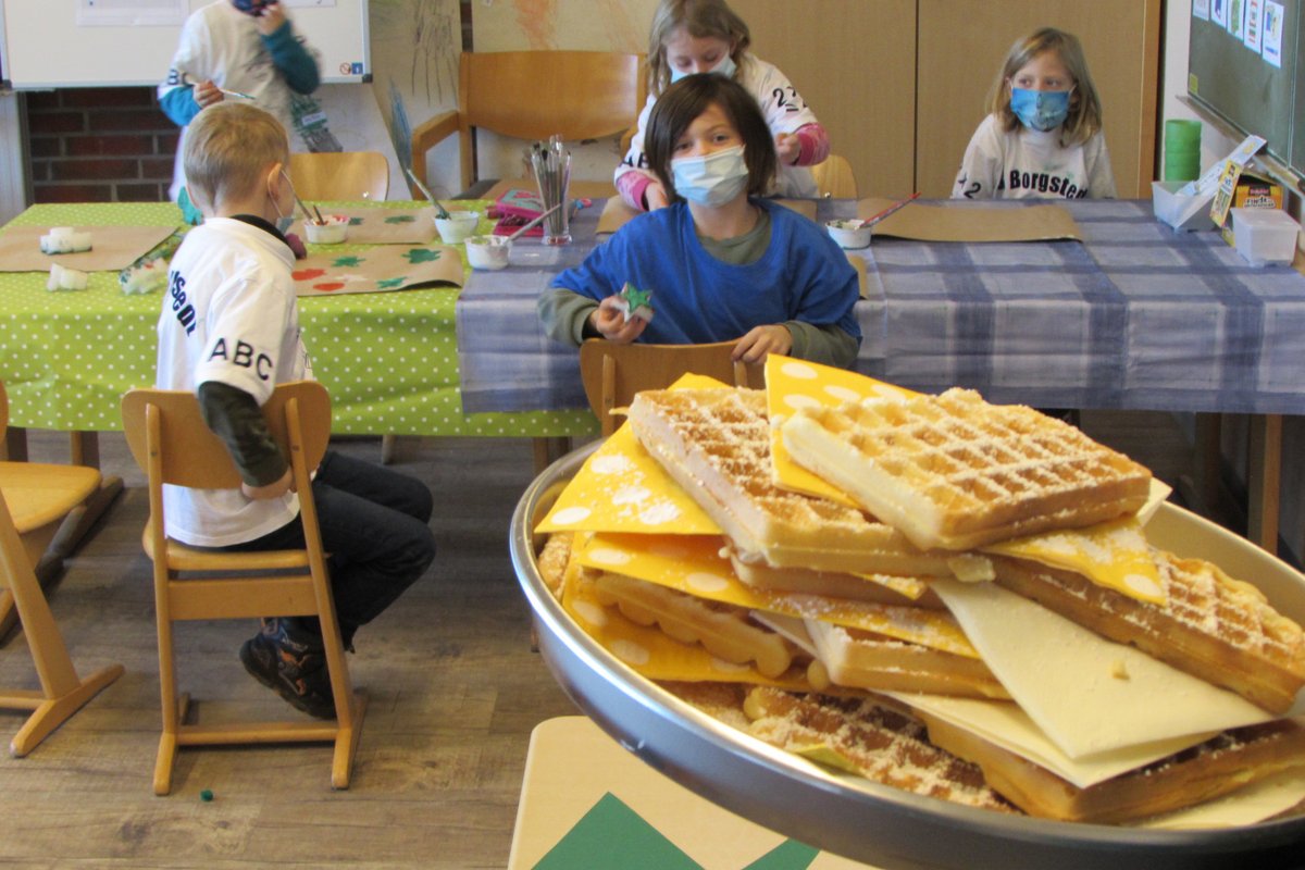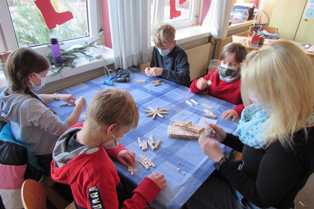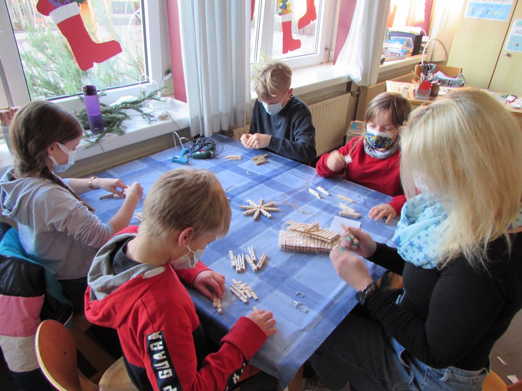 Der Nikolaustag ist in der Grundschule Borgstedt gleichzeitig der große Basteltag. In weihnachtlicher Atmosphäre mit Lichterketten, Weihnachtmusik und einem kleinen Gruß vom Nikolaus hieß es auch dieses Jahr wieder: „Auf die Klebe, Schere, los!“. In allen Klassen wurde fleißig gebastelt und so entstanden in den einzelnen Wichtelwerkstätten Fensterbilder, Weihnachtsbaumanhänger, Weihnachtskarten, Schneekugeln und vieles mehr. Der Duft von frisch gebackenen Waffeln strömte durchs Schulhaus und kurze Zeit später gab es einen leckeren Gruß aus der Schulküche. Damit sich die Finger vom Schneiden erholen konnten, lud Pippi Langstumpf jede Klasse zwischendurch in die Schulaula ein, um mit ihr Weihnachten zu feiern. Nach diesem Kinobesuch ging es dann natürlich weiter mit dem Basteln und durch die vielen fleißigen Wichtelhände erstrahlt unser Schulhaus nun in weihnachtlichem Glanz.