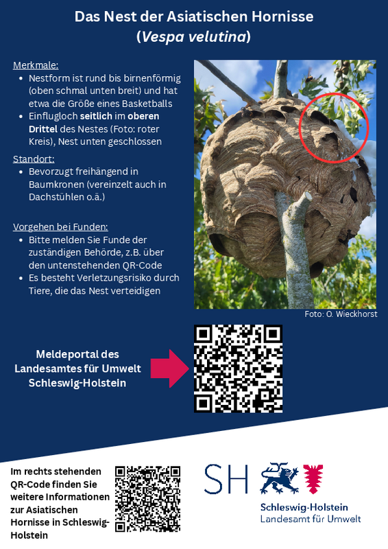 Im vergangenen Jahr wurde erstmalig auch in Schleswig-Holstein ein Nest der Asiatischen Hornisse (Vespa velutina nigrithorax) nachgewiesen. Der Erstfund eines solchen Primärnestes erfolgte in Wahlstedt. Dank aufmerksamer Bürger und einer konsequenten Verfolgung aller bestätigten Fundmeldungen von Einzeltieren konnten im Laufe des Jahres vier weitere Nester in Schleswig-Holstein gefunden werden. Insgesamt vier der fünf Nestern konnten erfolgreich entfernt werden. Das verbliebene Nest beim Kloster Nütschau war zuerst schwer auffindbar und aufgrund seiner Lage später nicht zu entfernen. Neben diesen bekannten Nestern ist, gerade in weniger besiedelten Gebieten, damit zu rechnen, dass weitere Völker unentdeckt geblieben sind.
