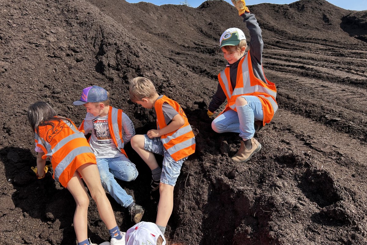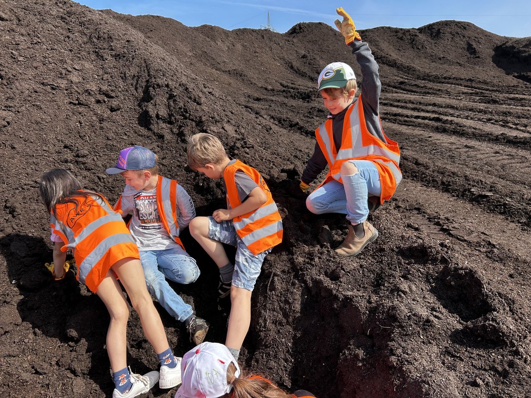 Nach einem kurzen Informationsfilm folgte ein Rundgang auf dem Gelände. Die mit Warnwesten und Arbeitshandschuhen ausgestatteten Kinder bestaunten die riesigen Hallen und die großen Fahrzeuge, die dort im Einsatz waren. Ihnen wurde der Weg des angelieferten Biomülls bis hin zum fertigen Kompost anschaulich erklärt. Eifrig suchten die Kinder nach Dingen, die nicht in den Biomüll gehören. Schnell füllten sich die bereitgestellten Eimer mit Plastiktüten und überraschenden Gegen-ständen wie einer Zahnbürste oder einem Schnuller. Viel Spaß machte es auch, die Hände tief in den warmen Kompost zu stecken. Zum Abschluss durften die Kinder noch im AWR-eigenen Garten toben.
