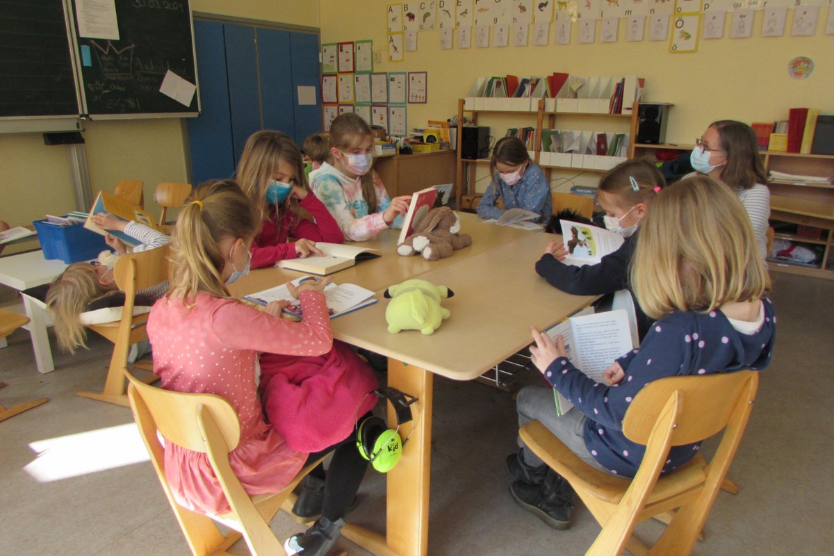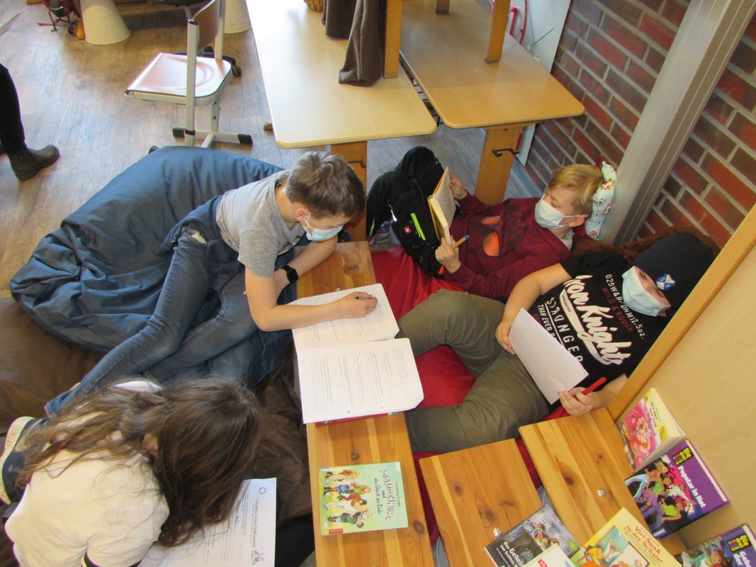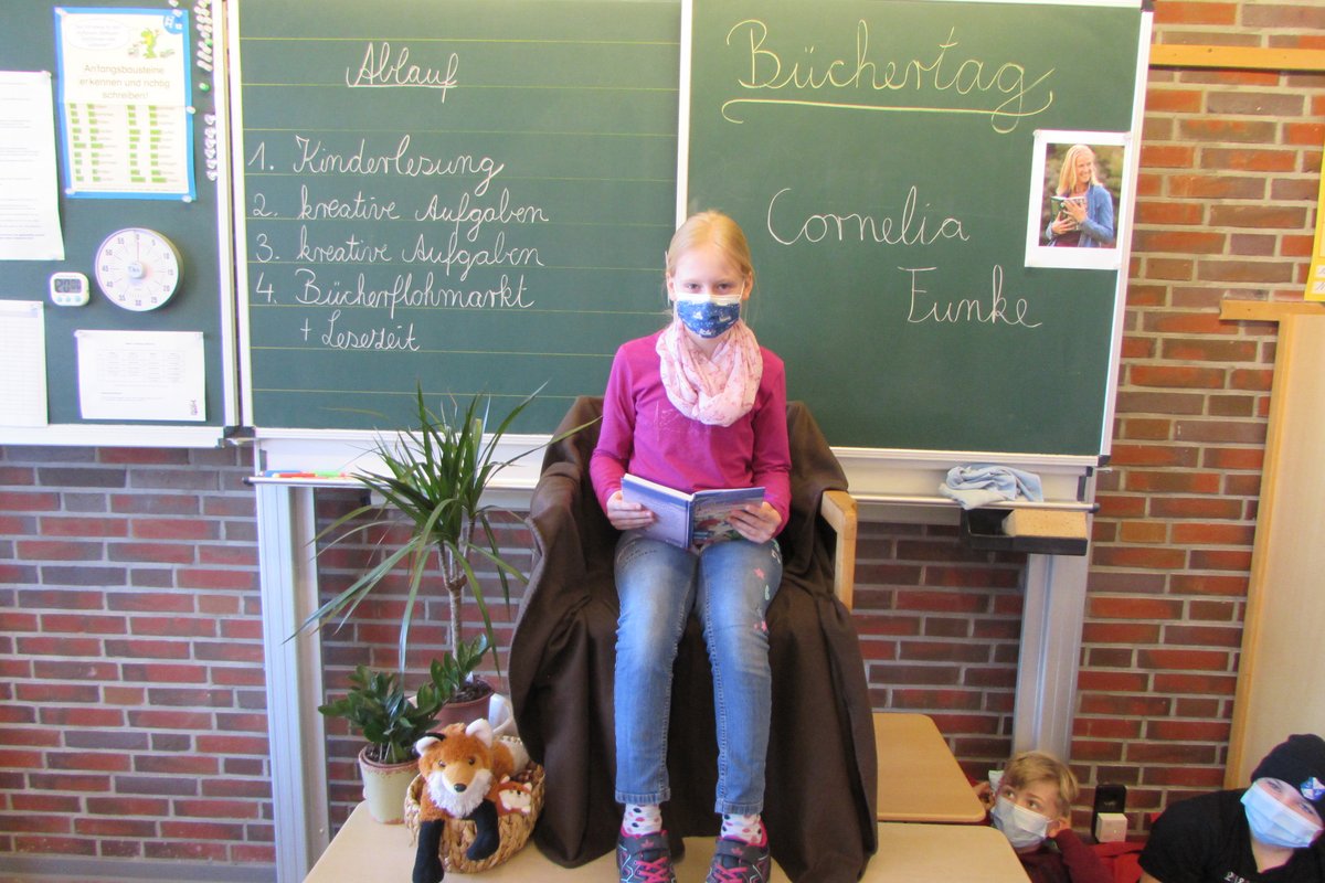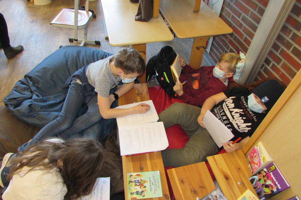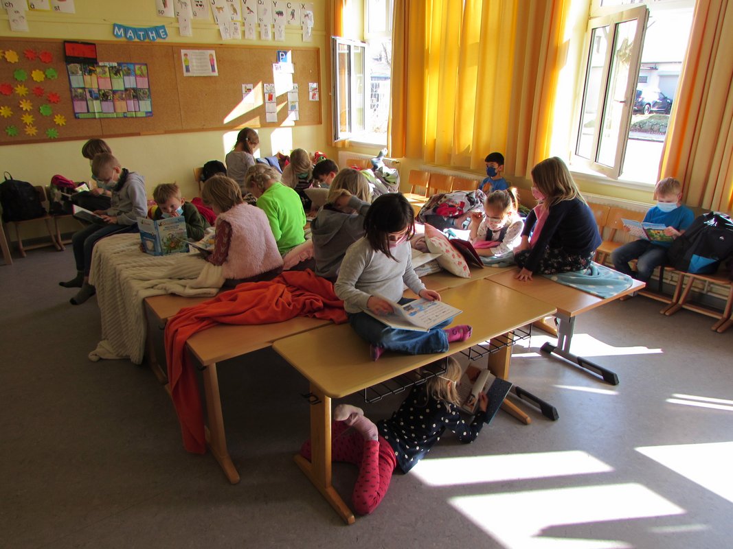 Kurz vor den Osterferien gab es an unserer Schule den Büchertag. In allen Klassenräumen drehte es sich um Bücher. Doch bevor man in die Welt der Bücher eintauchen kann, muss man es sich richtig gemütlich machen. Also hieß es ab auf oder auch unter die Tische, Stühle und Fensterbänke. Eingekuschelt in Decken und Kissen mit einem Kuscheltier als Begleiter und vielleicht einer Tasse Tee in der Hand lässt sich so ein Tag doch wunderbar genießen.