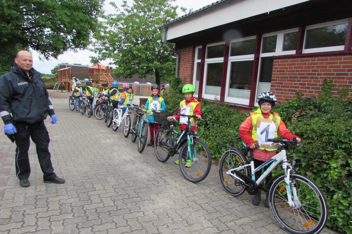 Heute kam der Verkehrspolizist nach Borgstedt, um die Fahrradprüfung abzunehmen. Nachdem die Kinder bereits fleißig die Theorie…