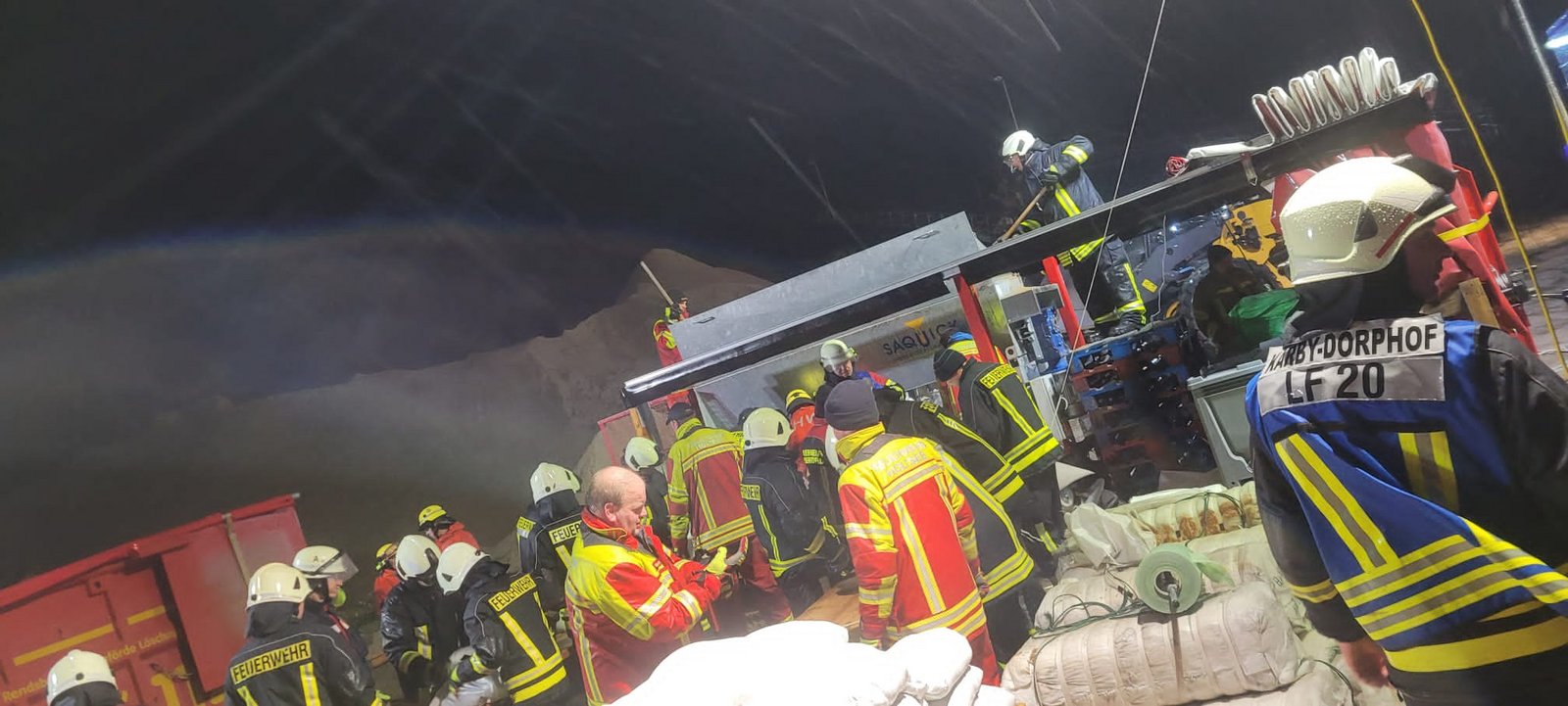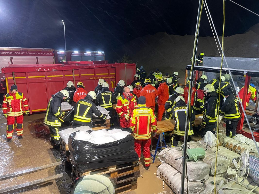 Nach einem Voralarm am Donnerstag um 19:30 Uhr bekamen wir am Freitag, den 20. Oktober um 11:50 Uhr einen Alarm für die 2. Feuerwehr-Landesbereitschaft. Über Whatsapp wurde eine Gruppe aus Leon Becker, Julian Haß, Kai-Uwe Haß, Sönke Koberg, Mirko Krabbenhöft, Pascal Ludat, Boris Neuhoff, Achim Seidel und Martin Thormählen zusammengestellt, die das LF KatS besetzt hat und zum Treffpunkt am Schulzentrum Süd in Eckernförde gefahren ist. Von dort wurden die Kameraden nach Damp verlegt, wo gemeinsam mit dem LF KatS der Feuerwehr Karby-Dörphof der Deich gesichert wurde. In den Abendstunden wurde Katastrophenalarm für den Bereich Eckernförde / Amt Schlei-Ostsee ausgelöst, sodass weitere Einheiten aus dem Kreisgebiet zur Verstärkung anrückten. Unsere Einheit wurde in Damp abgelöst und ab 21:30 Uhr unterstützten sie in der Kiesgrube in Gammelby beim Befüllen von Sandsäcken. Um 23:30 Uhr wurden sie aus dem Einsatz entlassen.