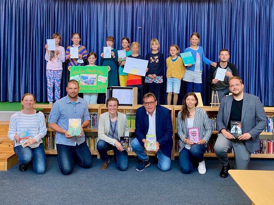 Abenteuer bestehen im Hundert-Morgen-Wald, in der Villa Kunterbunt oder in Hogwarts – Bücher ermöglichen das Eintauchen in fremde Welten und das Erleben von Außergewöhnlichem aus der Perspektive unzähliger Heldinnen und Helden. In Kooperation mit Amazon und der Stiftung Lesen kann genau dieses Eintauchen in die fantastische Welt der Bücher nun in unserem neuen Leseclub stattfinden. Die Belegschaft des Amazon Verteilzentrums in Borgstedt hatte dafür einen internen Wettbewerb der „Amazon Reads“-Kampagne gewonnen und konnte dadurch unsere Schule mit 6.000 € bei der Einrichtung eines Leseclubs unterstützen. Am Montag war es nun endlich so weit: Der in unsere Schulbücherei integrierte Leseclub konnte eröffnet werden. Dazu stellten Kinder eigene Comics vor und erzählten frei ein Märchen nach, was von selbstgestalteten Bildkarten begleitetet wurde. Alle Anwesenden, insbesondere die Vertreter von Amazon sowie des Schulverbands waren von so viel Kreativität begeistert. Zum Abschluss bedankten sich die Kinder im Namen der gesamten Schule mit einem Plakat bei der Belegschaft von Amazon für diese fantastische Unterstützung!