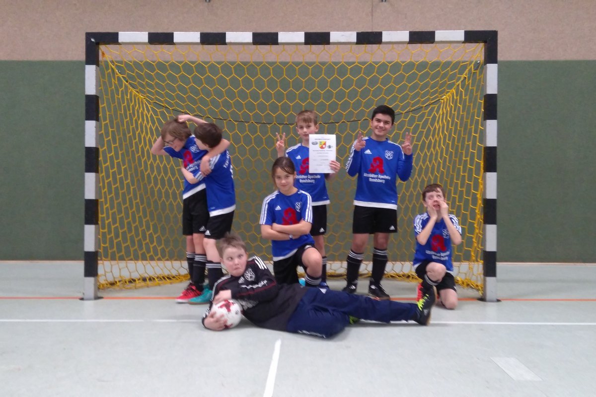 Wer in den Pausen schon immer auf dem "Bolzer" kickt, der kann natürlich auch in der Halle Tore schießen. Wenn man sich dann noch mit anderen Schulen messen kann, macht es gleich doppelt Spaß. Nach vier Spielen mit tollen Paraden, guten Kombinationen, gekonnten Dribblings und sehenswerten Toren belegte unsere Schule den 3. Platz. Ein großes Lob an die gesamte Mannschaft für diese Leistung und das tolle Verhalten auf und neben dem Platz. Vielen Dank an Frau Kaminski, die uns begleitet hat.