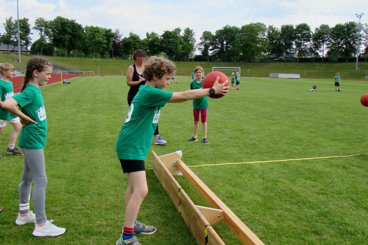 Für einige Kinder aus der dritten und vierten Klasse ging es heute besonders sportlich zu: Sie durften als Team unserer Schule bei den Leichtathletik-Kreismeisterschaften in Büdelsdorf an den Start gehen! Nach der kurzen Anreise im Bus wurden die Augen beim Anblick des tollen Stadions ganz groß. Voller Stolz wurden die schuleigenen Trikots angezogen und dann ging es auch schon los: Mit Schwung wurden beim Hürdenlauf die Bananenkartons überflogen, der Schlagball Richtung Himmel geschickt, der Medizinball über die Langbank gestoßen und neue Rekorde an der Weitsprunganlage aufgestellt. Zu guter Letzt ging es an den Ausdauerlauf – bei den schwül-warmen Temperaturen eine besondere Herausforderung. Aber auch das meisterte die Truppe hervorragend!