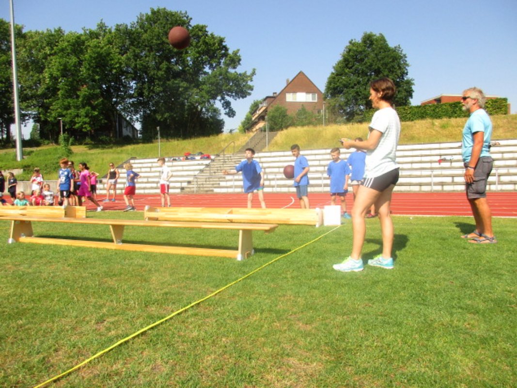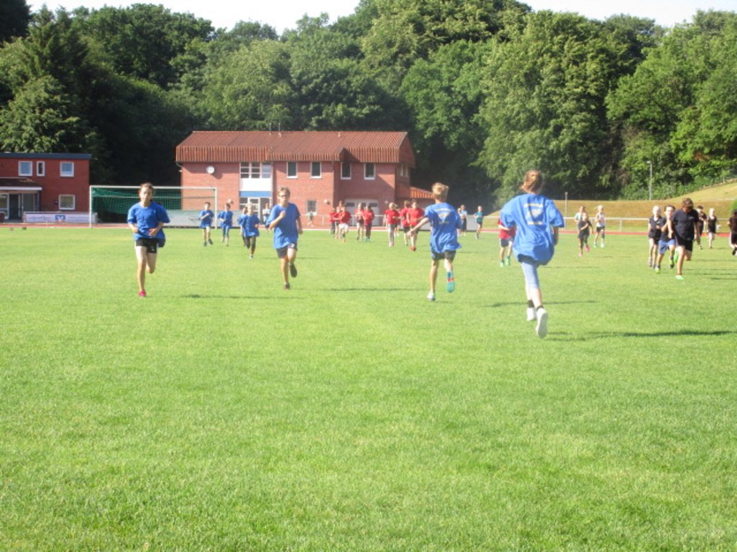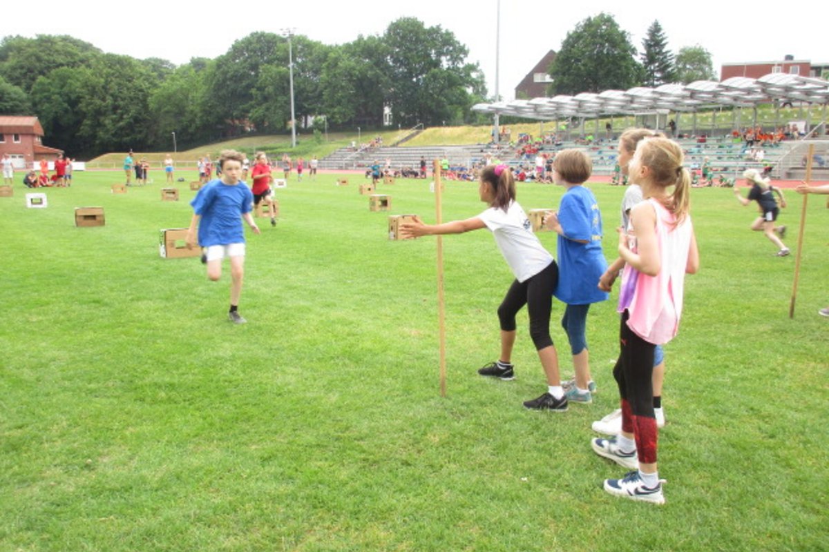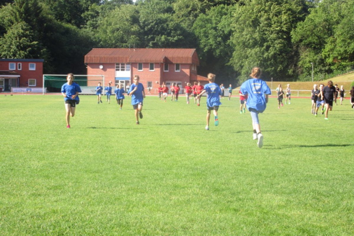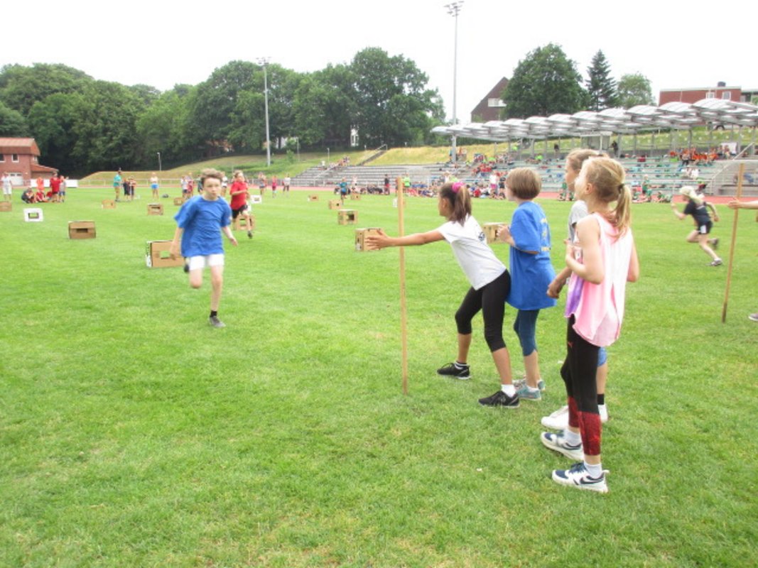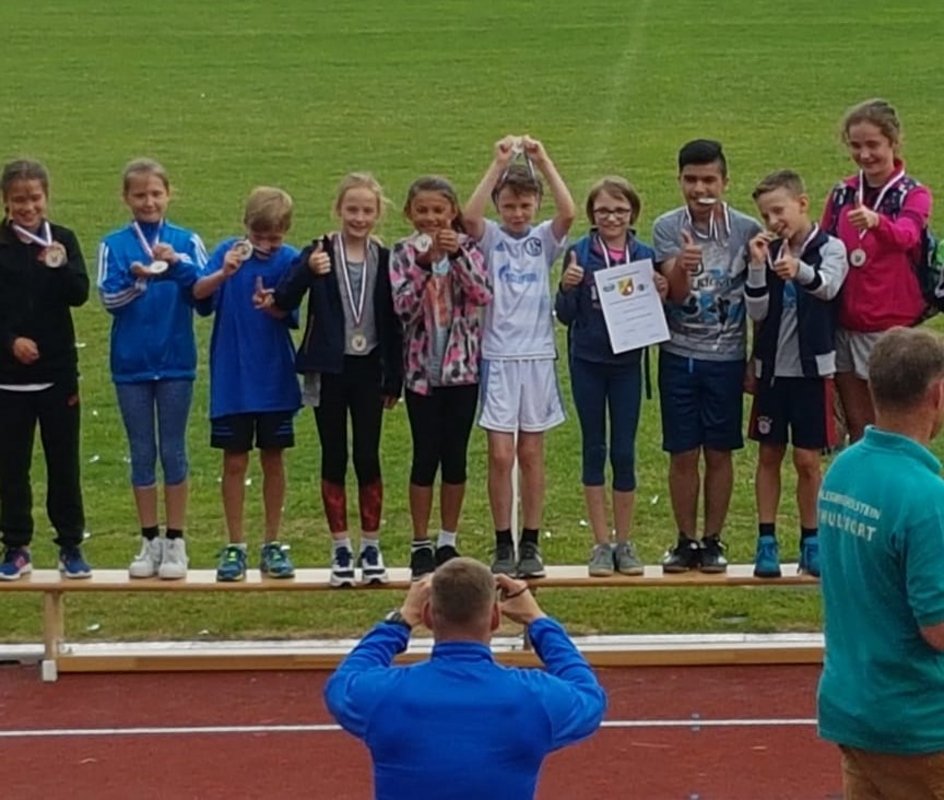 Im Eiderstadion in Büdelsdorf trat unsere Schulmannschaft in einen sportlichen Wettkampf mit vielen anderen Grundschulen. Es wurde nach Schnelligkeit und Ausdauer um die Wette gelaufen, versucht, am weitesten in die Sandgrube zu springen und die Muskeln beim Werfen und Stoßen spielen zu lassen. Jeder hat sein Bestes gegeben und so wurden bei der Siegerehrung ganz fest die Daumen gedrückt. Als das Ergebnis verkündet wurde, war die Freude riesengroß.