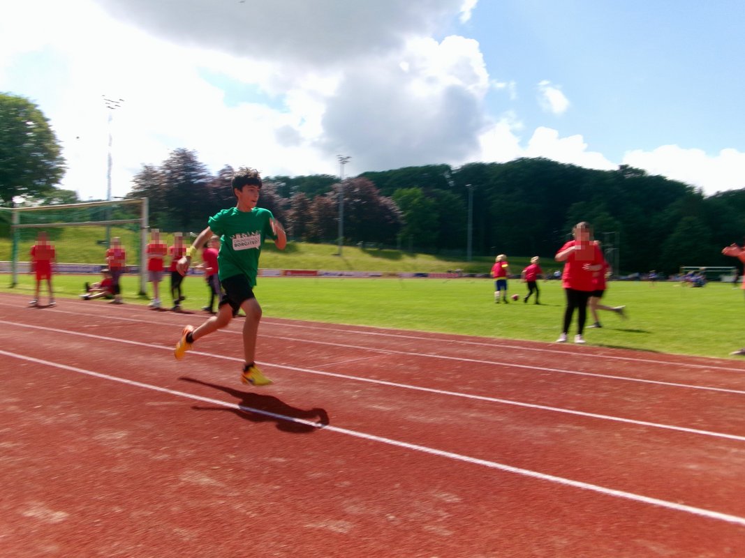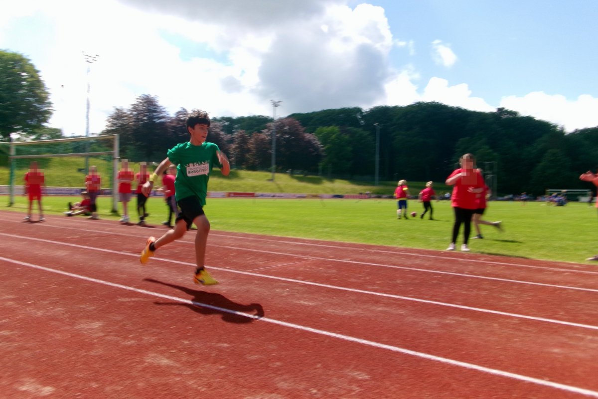 Das Team zog sich die Schulshirts an, verfolgte aufmerksam die Begrüßung, erwärmte sich kurz und dann ging es auch schon los: Mit Schwung wurden beim Hürdenlauf die Bananenkartons überflogen, der Schlagball Richtung Himmel geschickt, der Medizinball über die Langbank gestoßen und neue Rekorde an der Weitsprunganlage aufgestellt. Zu guter Letzt ging es an den Ausdauerlauf. Auch die Sonne ließ sich am heutigen Tag blicken und strahlte mit den Kindern um die Wette.