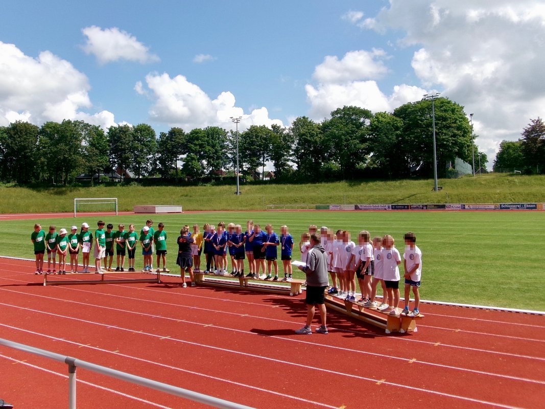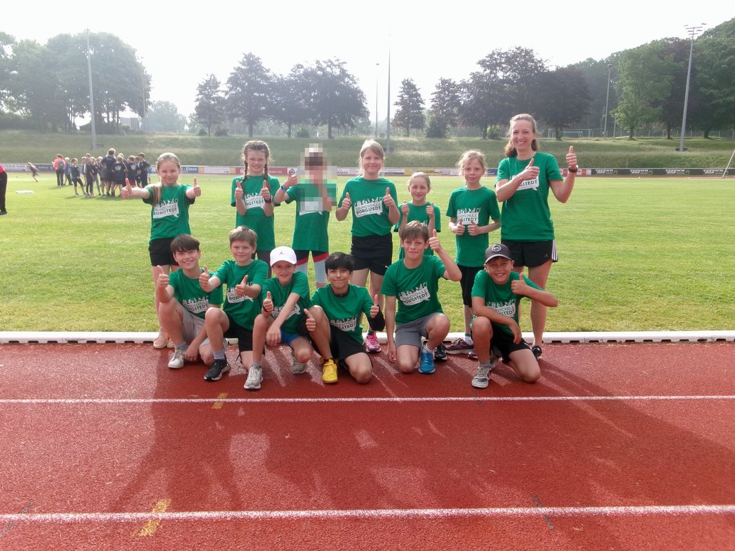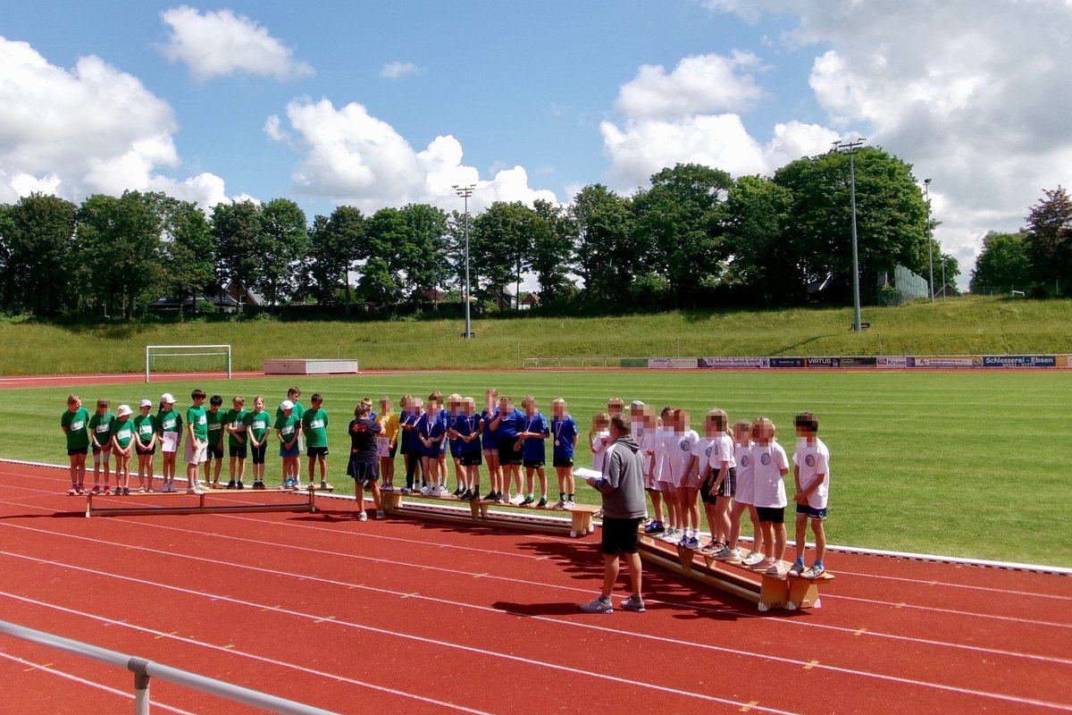 Auch in diesem Jahr fuhr wieder ein Team von 12 Kindern mit dem Bus in die Nachbarschaft nach Büdelsdorf, um sich dort mit 19 weiteren Grundschulmannschaften im wunderschönen Eiderstadion zu messen.
