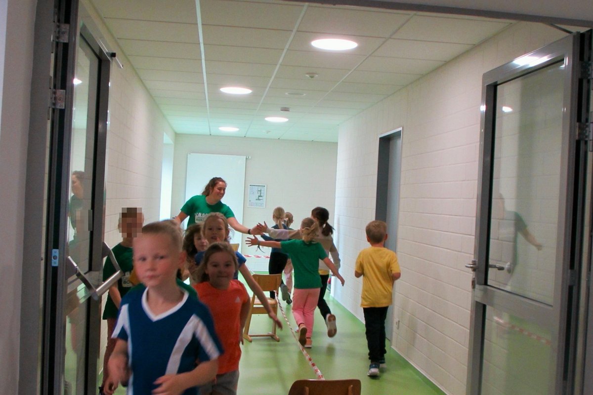 Gleich zu Wochenbeginn ging es mal wieder sehr sportlich bei uns zu: Wir haben am Aktionstag „Laufwunder“ der AOK teilgenommen. Ausgestattet mit unseren Laufwunder-Armbändern kamen wir ganz schön ins Schwitzen, als es galt, 60 Minuten durchzulaufen! Witterungsbedingt konnten wir zwar nicht wie geplant auf dem Schulgelände unsere Runden drehen, allerdings haben wir gezeigt, dass wir auch drinnen gar kein Problem damit haben, neue Rekorde aufzustellen. Zu Beginn gingen die Kinder eine Wette mit Herrn Jaekel ein: Er wettete, dass er mehr Liegestütze machen könne, als es Kinder schaffen würden, die 60 Minuten zu knacken. Als Wetteinsatz wurde ein Eis für alle Kinder eingeloggt. Nach der gemeinsamen Erwärmung durch die Erdmäuse in der Sporthalle ging es los: Klasse 1 und 2 machten das Schulgebäude unsicher (und durften dort ausnahmsweise laufen statt gehen) und Klasse 3 und 4 brachten den neuen Hallenboden ordentlich zum Vibrieren. Für kleine Energiekicks zwischendurch sorgten leckere Bananen, die der Edeka aus Büdelsdorf gesponsert hatte. Mit motivierender Musik sowie vielen anfeuernden und sogar mitlaufenden Eltern drehten am Ende noch 99 Kinder ihre Runden. Für die letzten zwei Minuten kamen auch die Laufenden aus dem Schulgebäude wieder in die Halle und reihten sich ein. Gemeinsam wurden die restlichen Sekunden gelaufen und der Jubel und Stolz war am Ende bei allen groß. Noch größer wurde die Freude allerdings, als Herr Jaekel seine Wette ganz knapp verlor und alle Kinder ihr verdientes Eis bekamen. Wir waren beeindruckt von allen gezeigten sportlichen und unterstützenden Leistungen - bei Groß und Klein, bei 5 und bei 60 Minuten!
