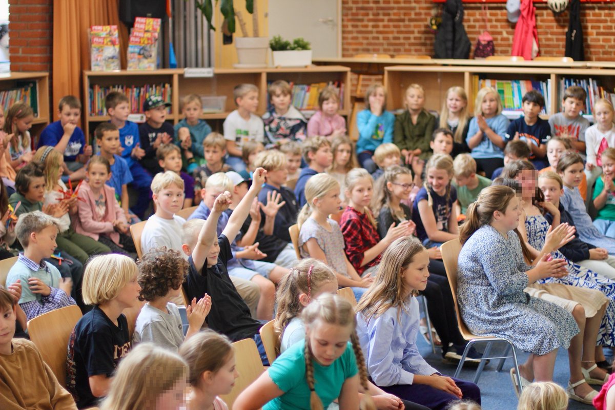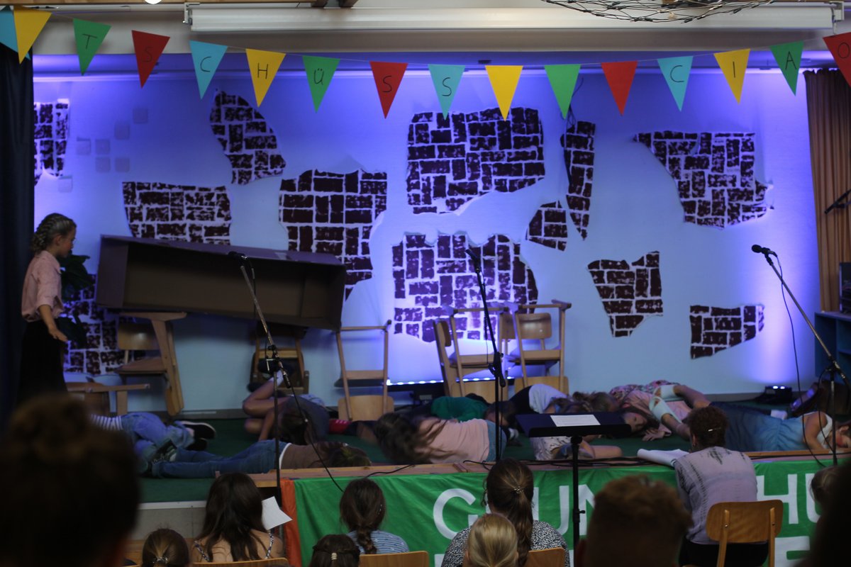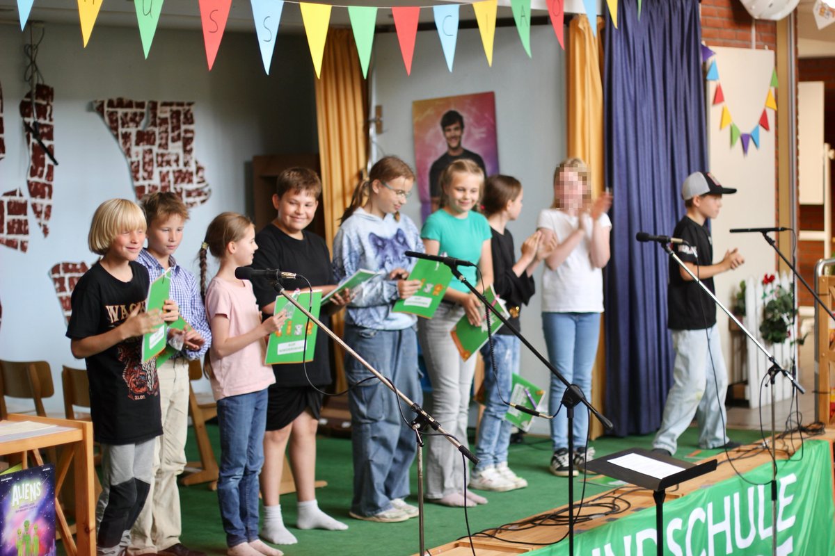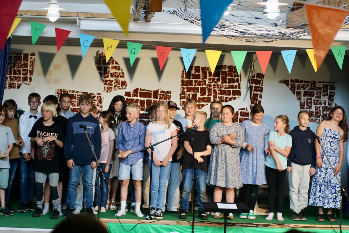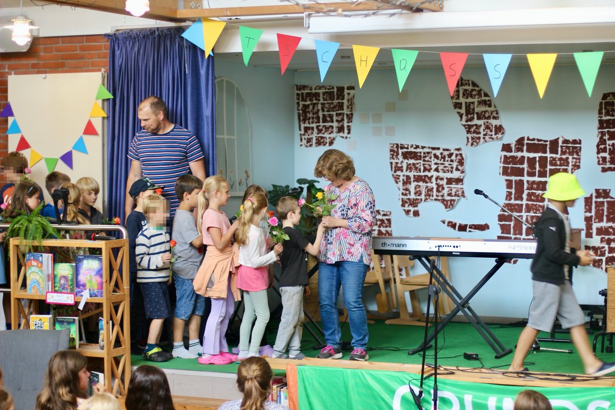 Danach wurde es für Klasse 4 noch einmal richtig festlich: Gemeinsam mit ihren Familien wurden sie mit einem Auftritt des Musikprojekts, einem Theaterstück sowie persönlichen Worten herzlich verabschiedet. Auch die Kinder selbst hatten etwas vorbereitet – ein großes Dankeschön an das Schulteam, begleitet von liebevollen Gesten.