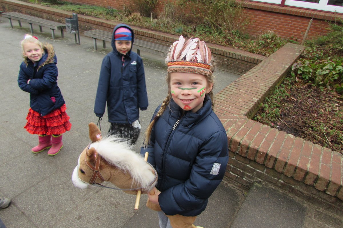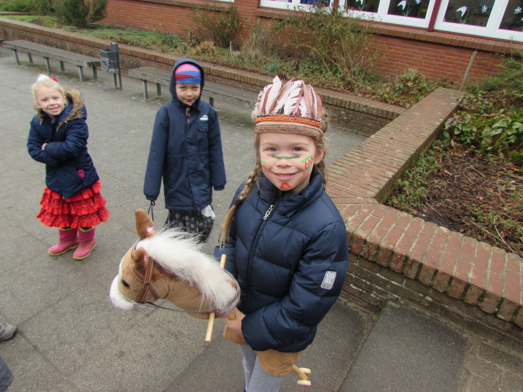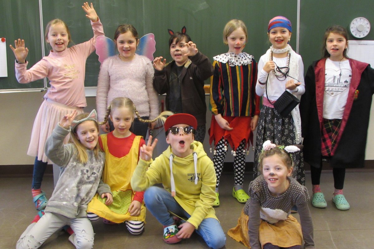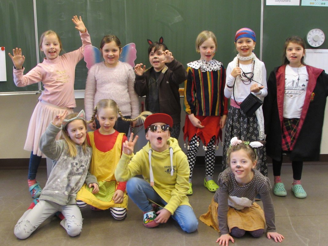 Es war ein toller Tag, denn es war Mottotag zum Thema Fasching. Es gab Cowboys, Anakin Skywalker, Hippies, Polizisten, Einhörner und vieles mehr. Die Lehrer haben sich auch verkleidet. Die Kinder haben ihre Kostüme die ganze Zeit getragen. Sie sind damit Seil gesprungen und einige haben sogar verkleidet Fußball gespielt.