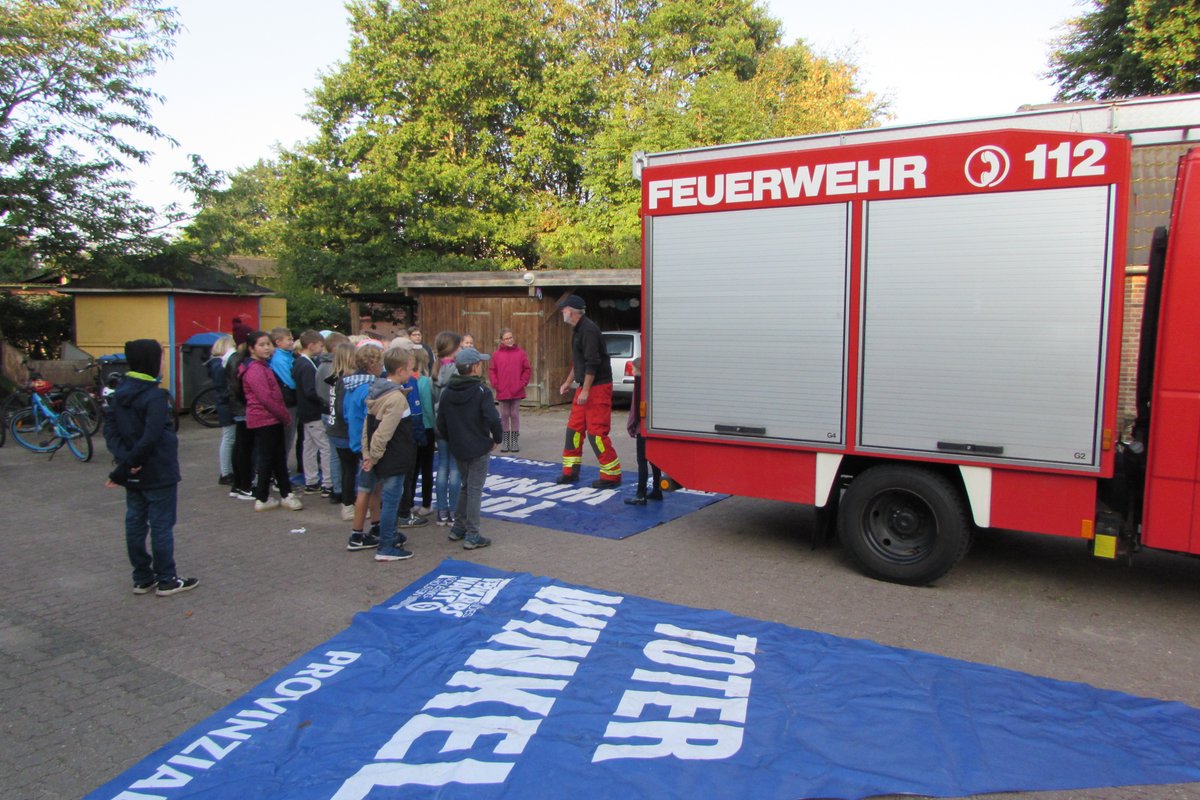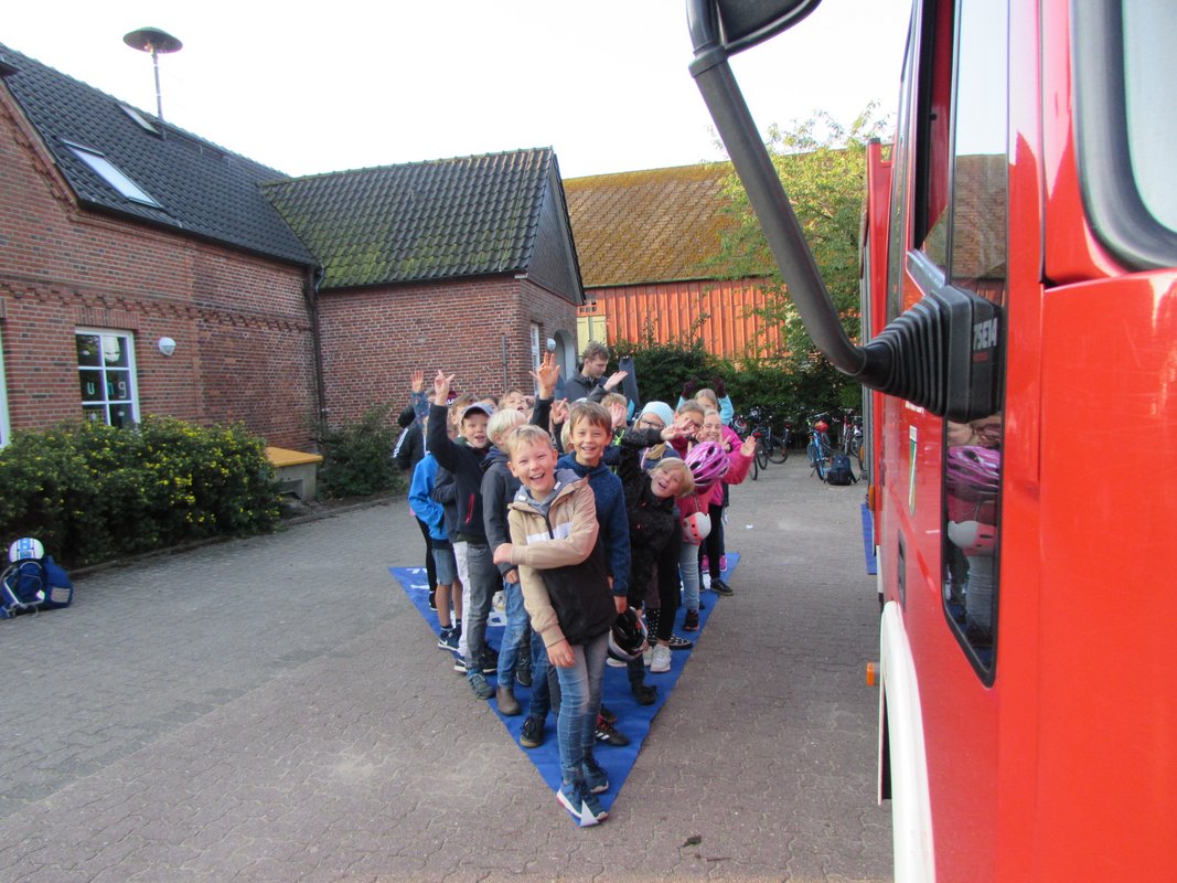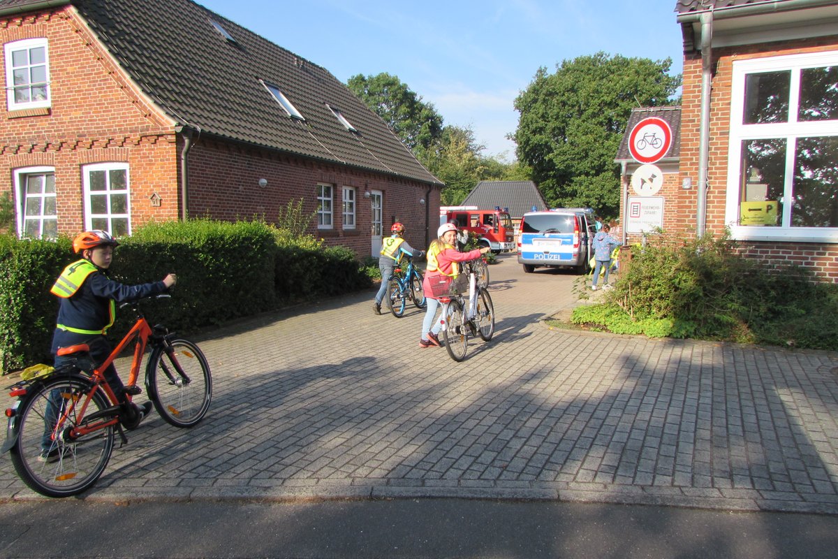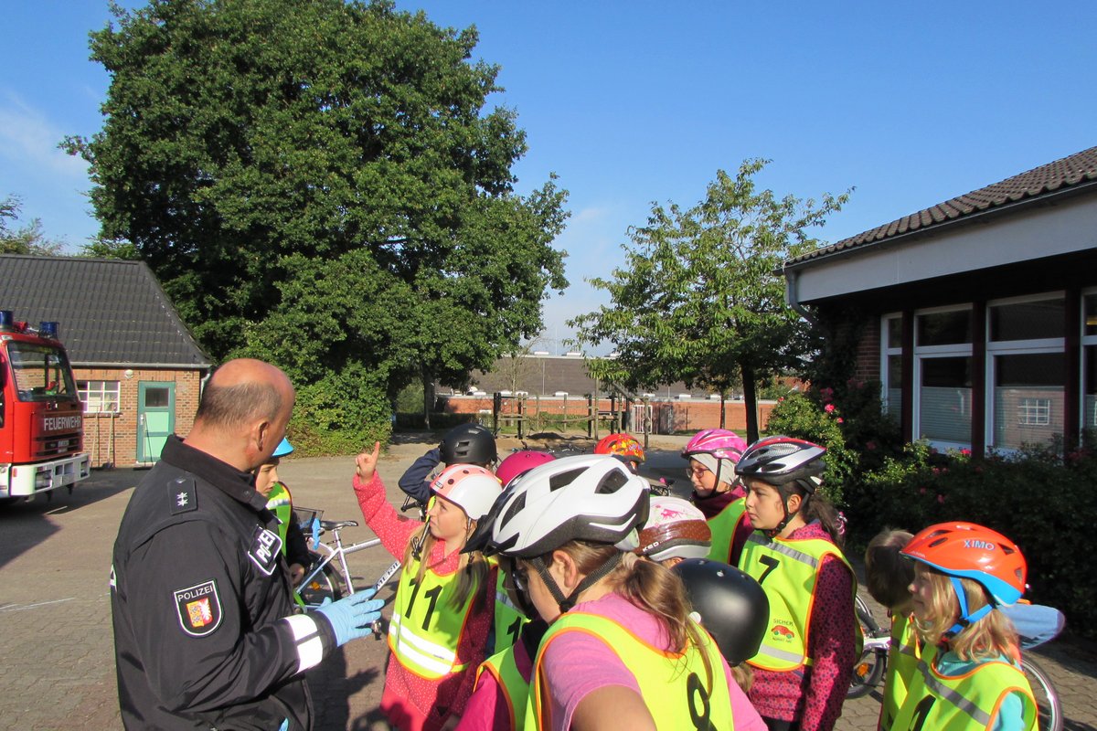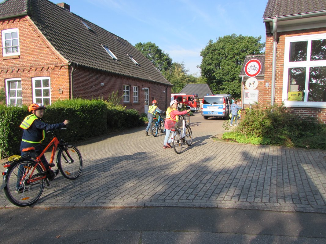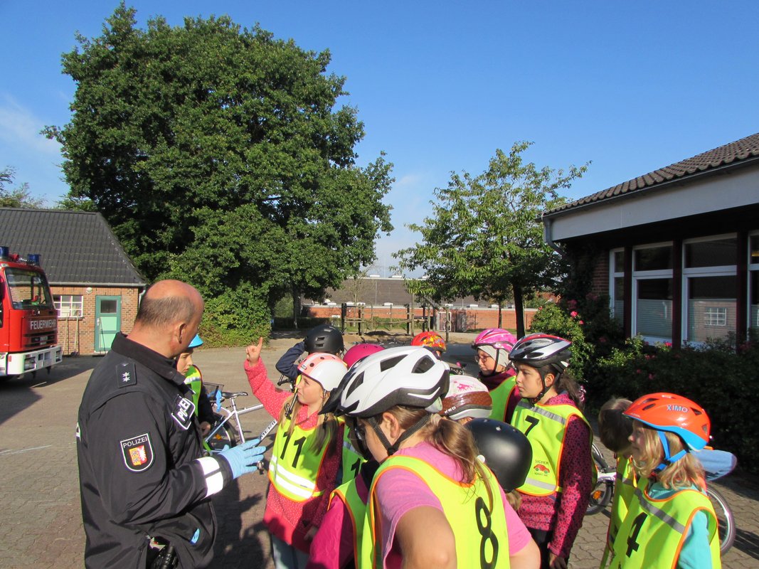 Die Polizei und die Feuerwehr in der Grundschule Borgstedt? Da musste ja etwas Besonderes passiert sein. Aber keine Angst, es hat nicht gebrannt und es wurde auch niemand verhaftet. Nein, die Radfahrprüfung für die Viertklässler stand auf dem Plan. Alle waren sehr aufgeregt. Dieses Gefühl verflog aber schnell wieder, denn alle Fahrräder waren verkehrssicher und die Viertklässler gut vorbereitet. Während einige sich schon auf den Weg durch Borgstedt machten, konnten andere am Feuerwehrauto den toten Winkel erkunden. Noch ein letztes Mal das Fahrrad über die Straße an der Ampel schieben und dann war es geschafft.