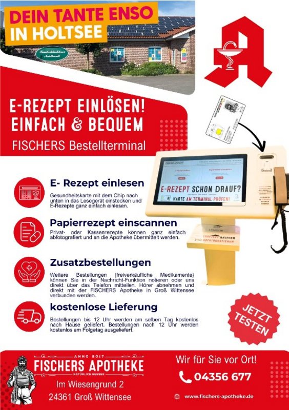 Bei Tante Enso wurde von Fischers Apotheke (Groß Wittensee) ein Bestellterminal aufgestellt, an dem Rezepte eingelöst werden können. E-Rezepte können durch Einstecken der Gesundsheitskarte eingelöst werden. Für Papierrezepte gibt es die Möglichkeit, diese einzuscannen. Zusatzbestellungen und freiverkäufliche Medikamente können in einer Nachrichtenfunktion notiert werden.