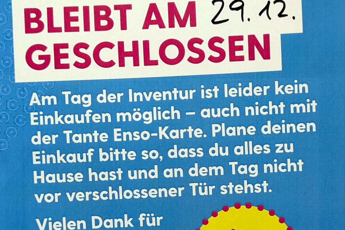 Am 29. Dezember ist Inventur bei Tante Enso und kein Einkaufen möglich, auch nicht mit der Tante-Enso-Karte.